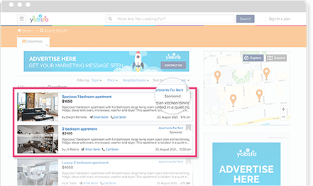 Have your classified listing featured in high traffic locations across the site to help bring more exposure to your post and achieve your goal. Found on the priority placement in classified search results and information strips on the homepage and Classifieds Section landing pages.