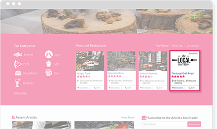 Have your business listing featured in high traffic locations across the site. Found on information strips on the homepage, Business and Restaurant Section landing pages.