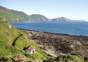 A spectacular secluded bay on the west coast, Niarbyl (Manx for "The Tail") is famous for its rolling coastal views and the iconic white-washed cottage that stands right on the shoreline. This traditional fisherman's cottage was a central filming location for the movie Waking Ned, doubling as a remote Irish home.